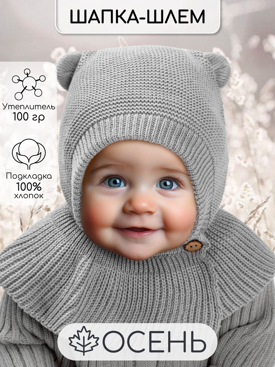 Шапка-шлем вязаная AmaroBaby Pure Love Helmet с подкладом ЧЗ серый 42