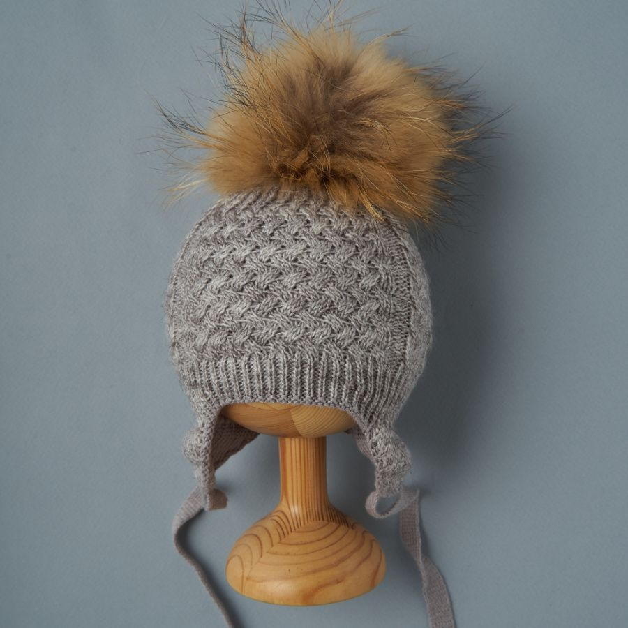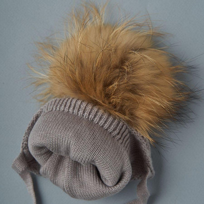 Шапочка двойная вязка Little Star Альба бумбон - мех енота 5570 (ЧЗ-нк) серый меланж 38
