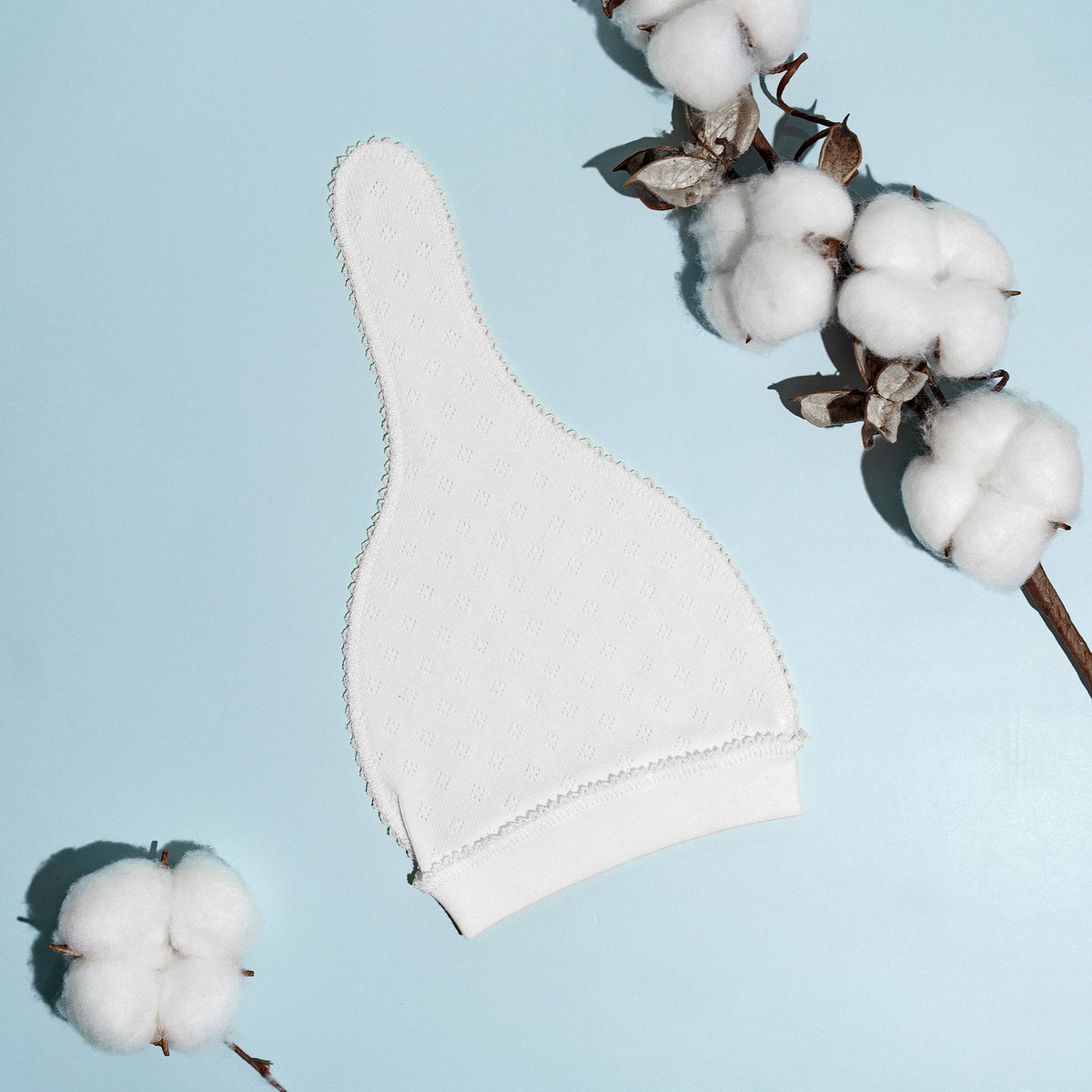 Состав шапочки — 100% хлопок, что делает её мягкой и приятной на ощупь.