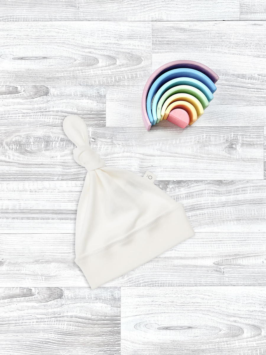 Шапочка с узелком Mjölk [мьёльк] Экрю выполнена из нежного трикотажного 100% хлопка. Материал эластичный, не вызывает аллергии, дарит ребёнку уют и комфорт, а однотонная расцветка придаёт малышу нарядный образ.