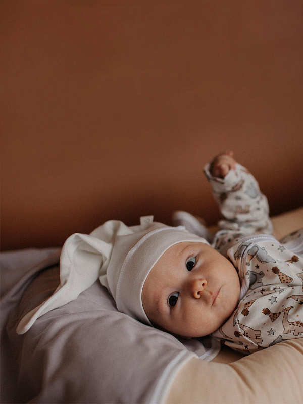 Шапочка с узелком mjölk [мьёльк] выполнена их трикотажного хлопка, который подходит нежной коже новорожденного, не вызывает аллергии и дарит малышу комфорт.