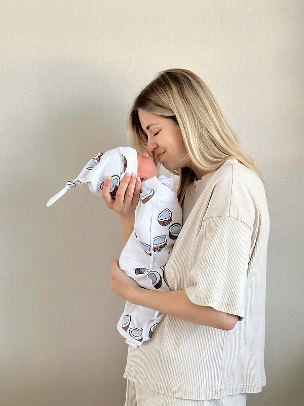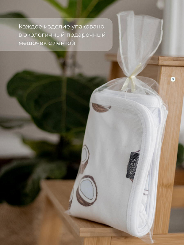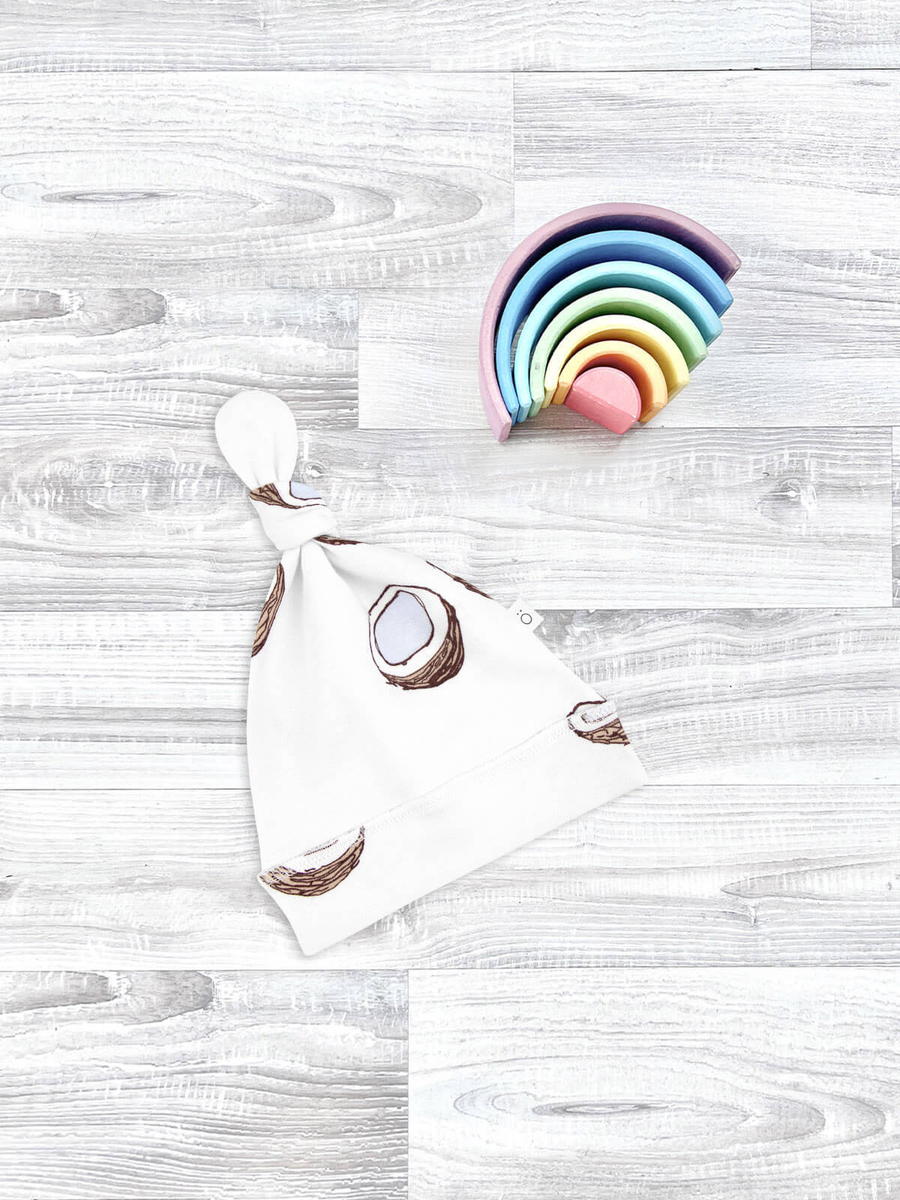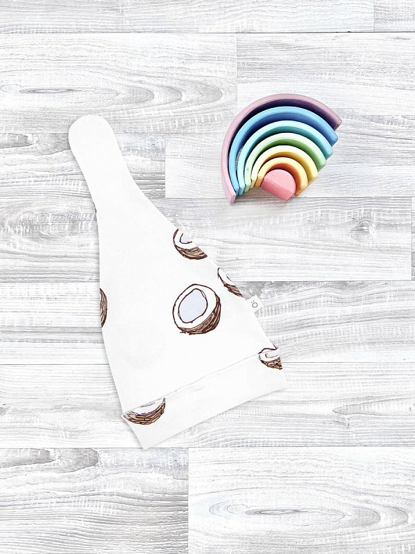 Шапочка с узелком Mjölk [мьёльк] Кокосы выполнена из нежного трикотажного 100% хлопка. Материал эластичный, не вызывает аллергии, дарит ребёнку уют и комфорт, а стильный принт придаёт малышу милый и нежный образ.