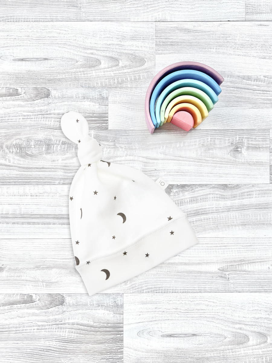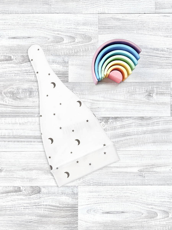 Шапочка с узелком Mjölk Ночное небо выполнена из нежного трикотажного 100% хлопка. Материал эластичный, не вызывает аллергии, дарит ребёнку уют и комфорт, а милый принт придаёт малышу нарядный и стильный образ.