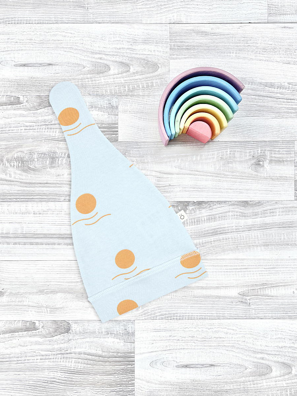 Шапочка с узелком Mjölk [мьёльк] Новый день выполнена из нежного трикотажного 100% хлопка. Материал эластичный, не вызывает аллергии, дарит ребёнку уют и комфорт, а нарядный принт придаёт малышу яркий и лаконичный образ.