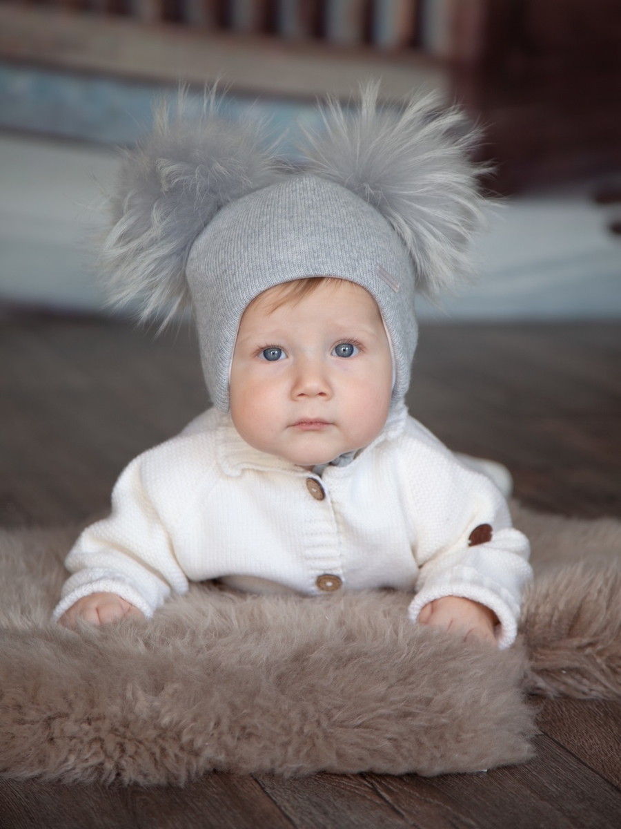 Вязаная теплая шапка из шерсти тонкорунного мериноса и беби кашемира отлично подойдёт ребёнку для прогулки в зимний период. Удобные мягкие завязочки позволяют шапочке плотно сидеть на голове и не сползать на глаза. Шапочка хорошо закрывает ушки, защищая от холода и ветра. Шапка имеет хлопковый подклад и утеплитель термофин, головке малыша будет мягко и тепло. Изделие дополнено двумя большими съемными помпонами из натурального меха енота в цвет.