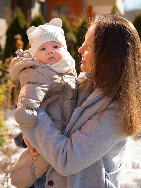 Шапочка зарекомендовала себя отличной посадкой на голову малыша. Удобные завязки и дополнительные изгибы на ушках позволяют шапочке плотно зафиксироваться в правильном положении на голове ребенка.