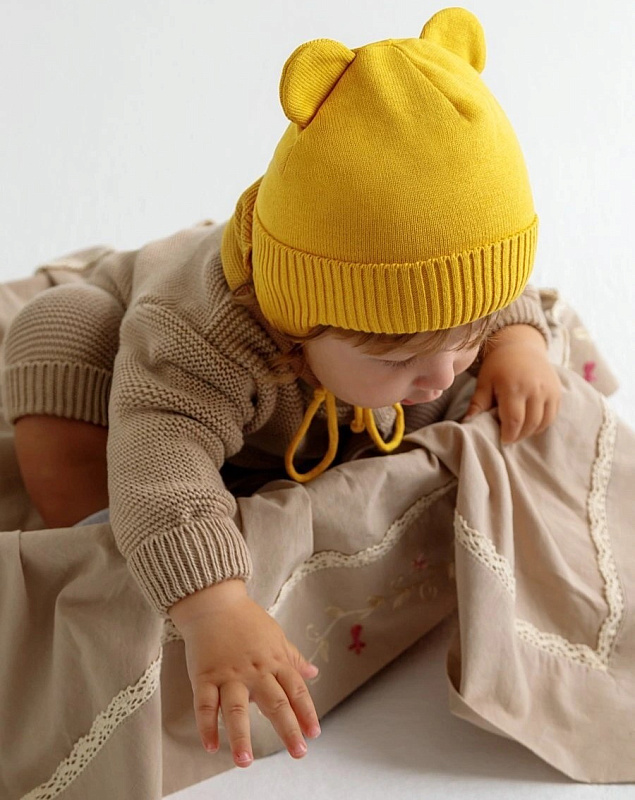 Шапочка зарекомендовала себя отличной посадкой на голову малыша. Удобные завязки и дополнительные изгибы на ушках позволяют шапочке плотно зафиксироваться в правильном положении на голове ребенка.