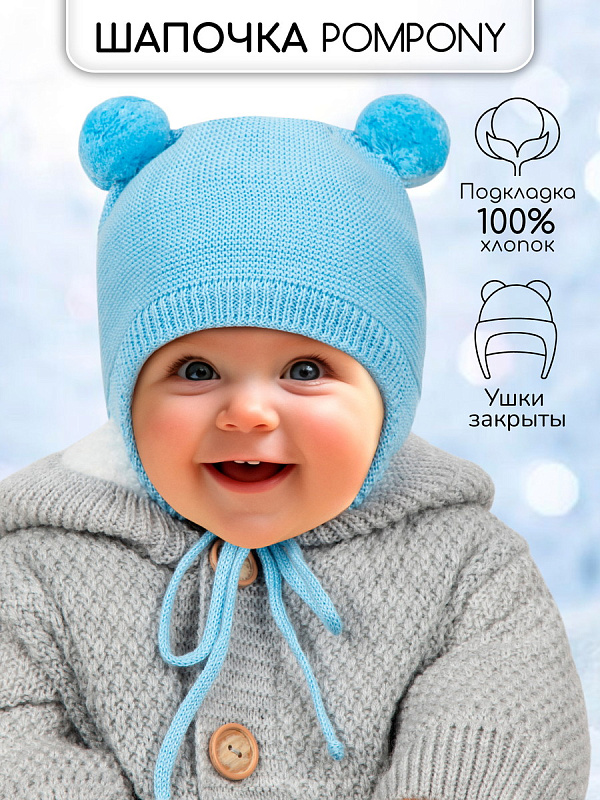 Шапочка вязаная AmaroBaby Pure Love Pompony с подкладом ЧЗ голубой 42