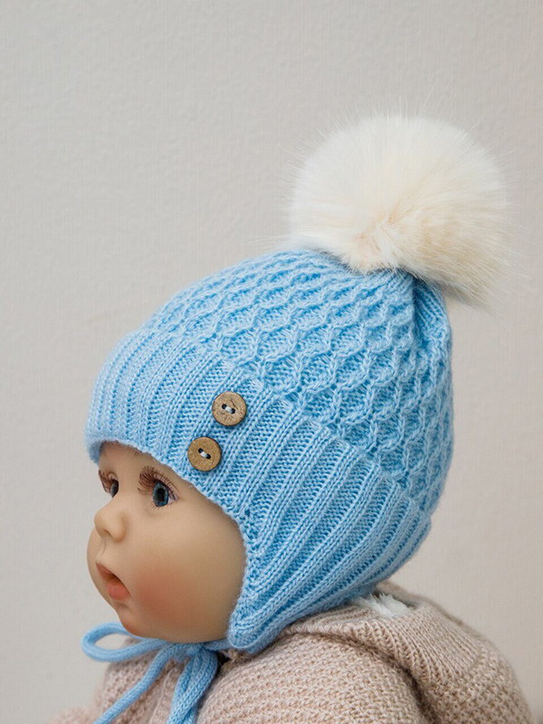 Вязаная утепленная шапочка украшена пушистым помпоном и оригинальными декоративными пуговками. Внутренний наполнитель покрывает всю внутреннюю площадь шапки и прекрасно удерживает тепло внутри.