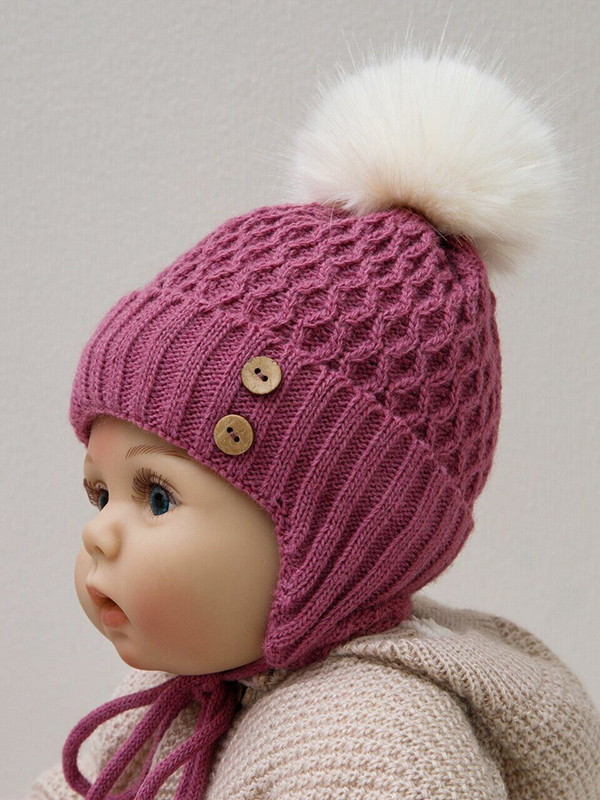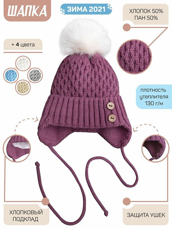 Вязаная утепленная шапочка украшена пушистым помпоном и оригинальными декоративными пуговками. Внутренний наполнитель покрывает всю внутреннюю площадь шапки и прекрасно удерживает тепло внутри.