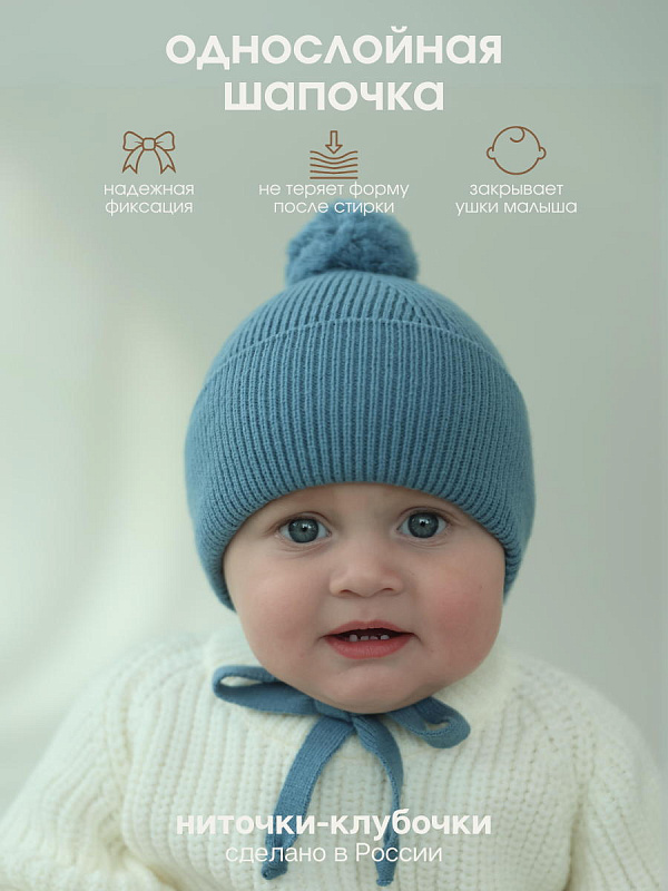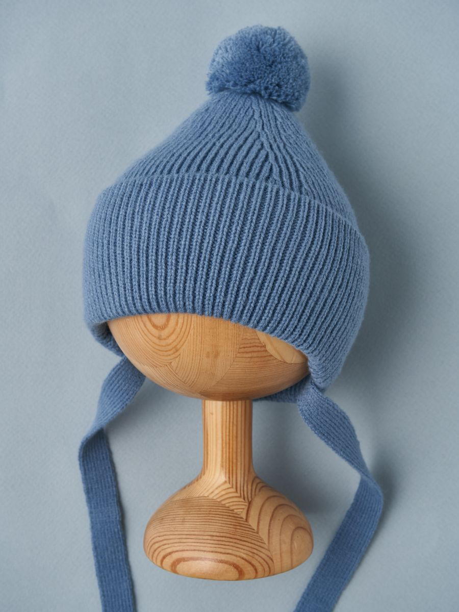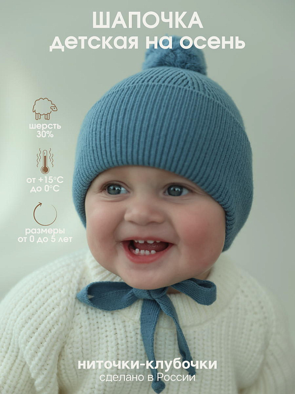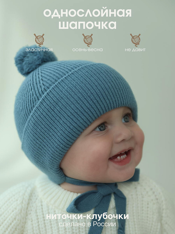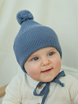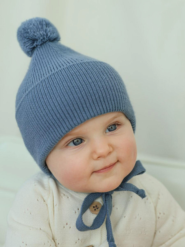 Шапочка с завязками выполнена из смесовой пряжи с хлопком, шерстью мериноса и ПАН-ом. Хлопок придает нежность, шерсть делает ее мягкой и теплой, а ПАН - неприхотливой в уходе.