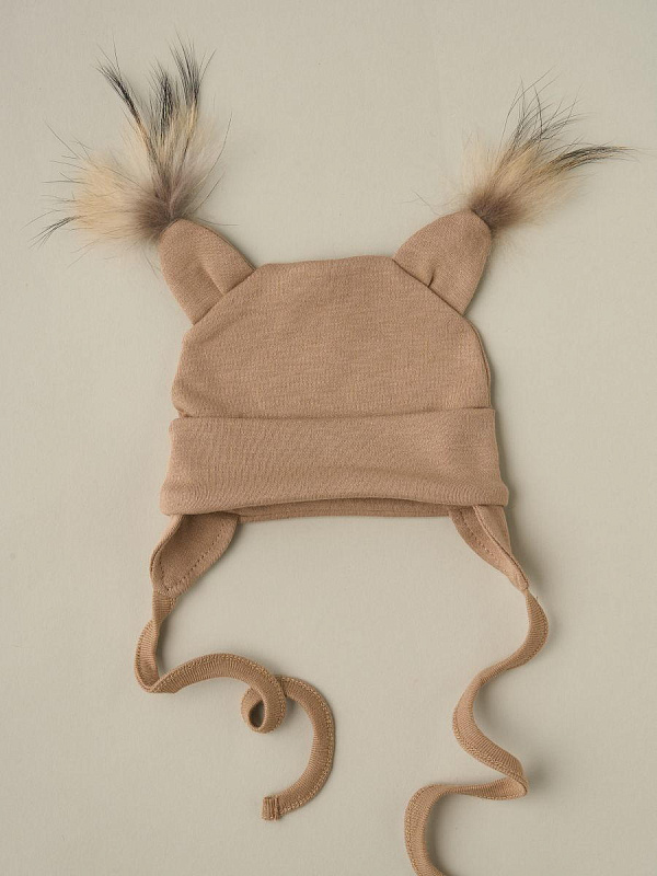 Хлопковая шапочка из трикотажного полотна. Имеет отличную посадку и очень милый дизайн с ушками и натуральным мехом. УХОД: рекомендована ручная стирка с использованием детского порошка. Не отбеливать.