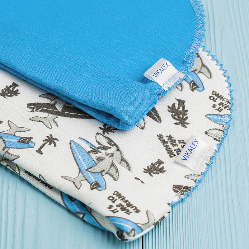 Комплект шапочек состоит их двух изделий. Модели выполнены из натуральной хлопковой ткани, которая хорошо пропускает воздух и немного тянется. Швы изделий выполнены с наружной части и не вызывают дискомфорта у ребенка.