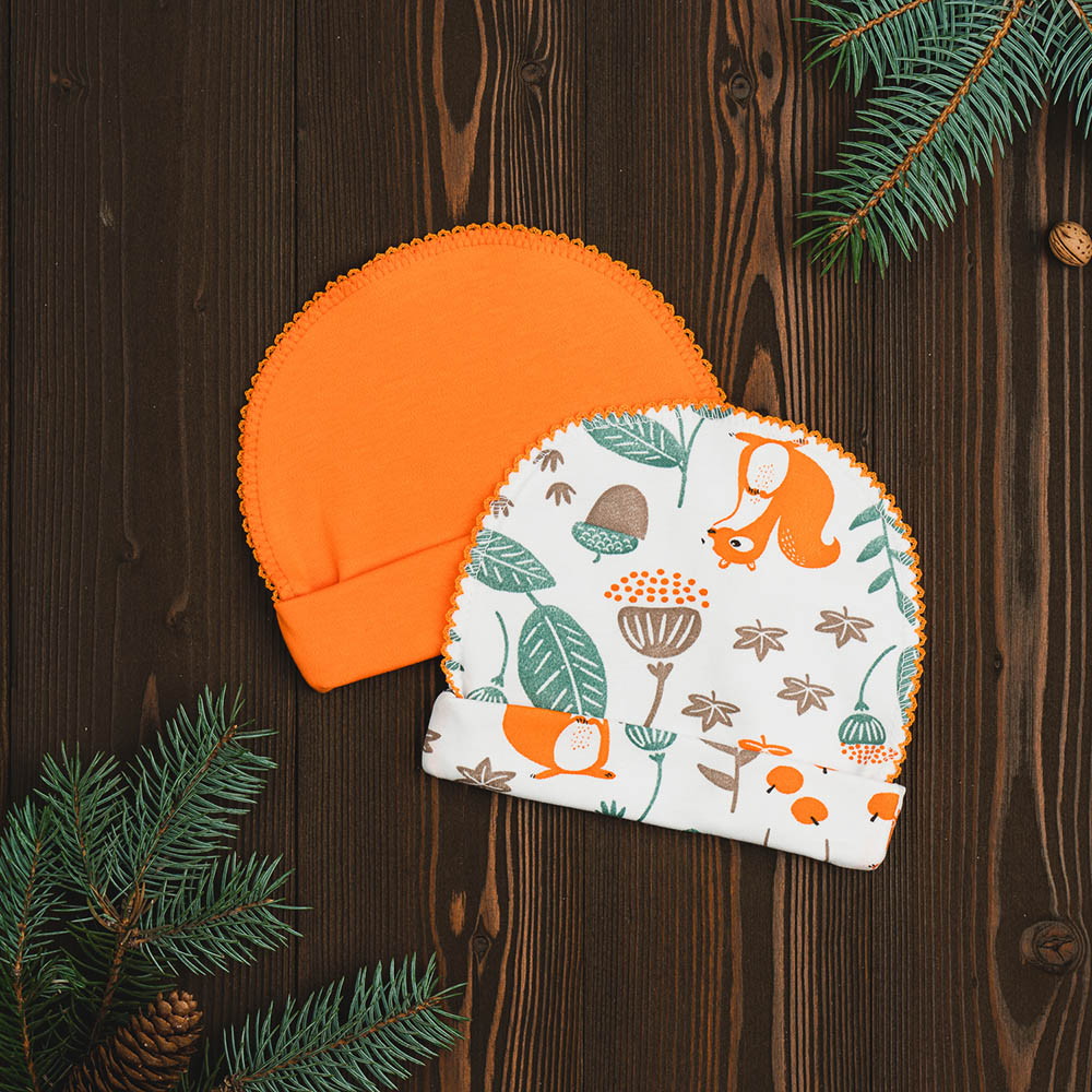 Комплект шапочек состоит их двух изделий. Модели выполнены из натуральной хлопковой ткани, которая хорошо пропускает воздух и немного тянется. Швы изделий выполнены с наружной части и не вызывают дискомфорта у ребенка.