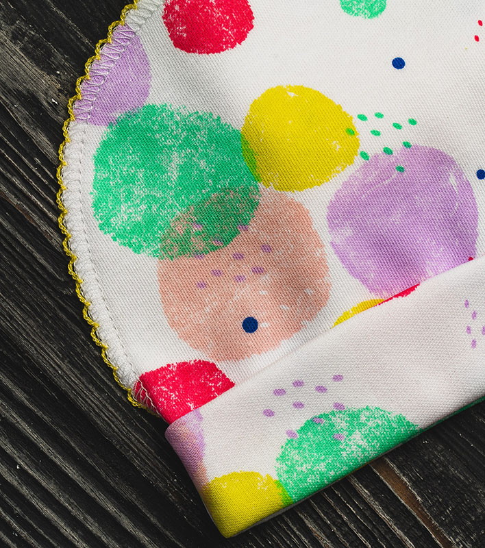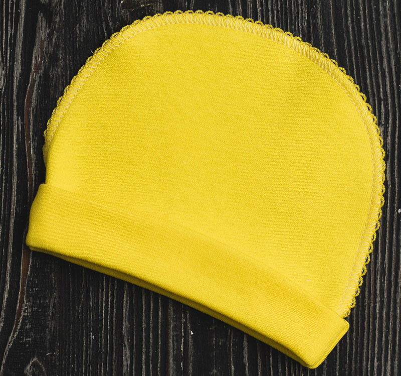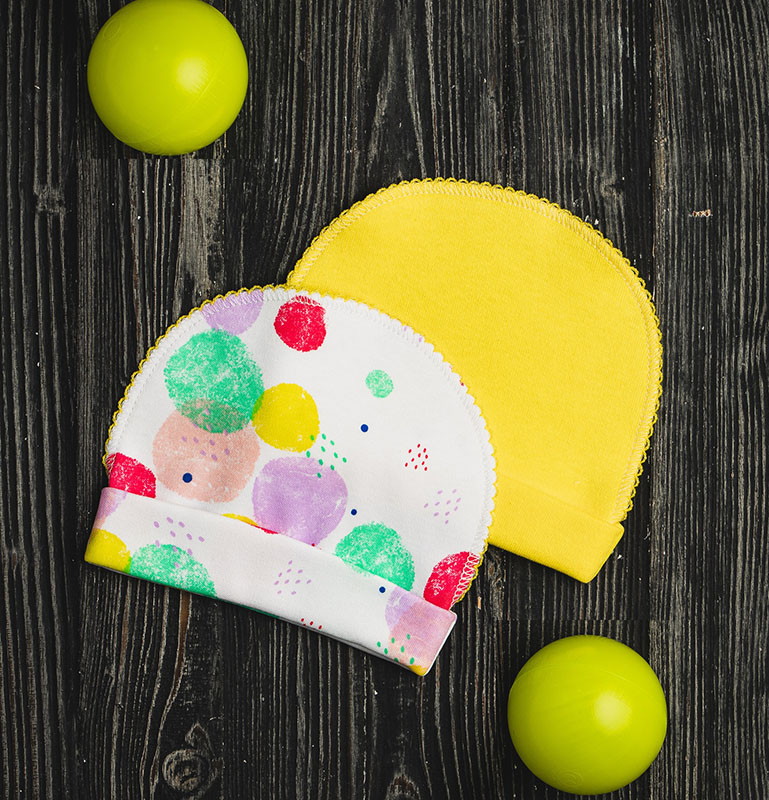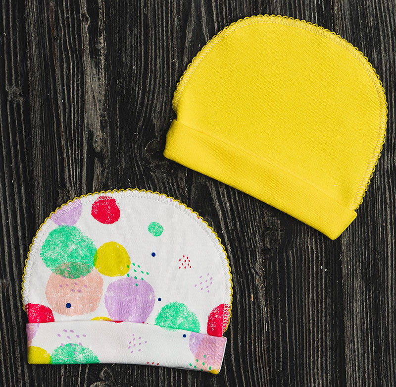 Комплект шапочек состоит их двух изделий. Модели выполнены из натуральной хлопковой ткани, которая хорошо пропускает воздух и немного тянется. Швы изделий выполнены с наружной части и не вызывают дискомфорта у ребенка.