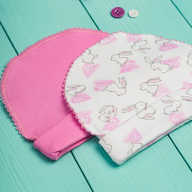 Комплект шапочек состоит их двух изделий. Модели выполнены из натуральной хлопковой ткани, которая хорошо пропускает воздух и немного тянется. Швы изделий выполнены с наружной части и не вызывают дискомфорта у ребенка.