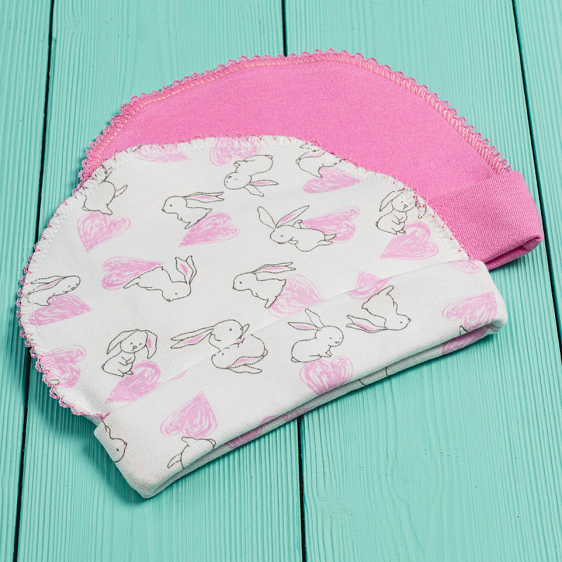 Комплект шапочек состоит их двух изделий. Модели выполнены из натуральной хлопковой ткани, которая хорошо пропускает воздух и немного тянется. Швы изделий выполнены с наружной части и не вызывают дискомфорта у ребенка.