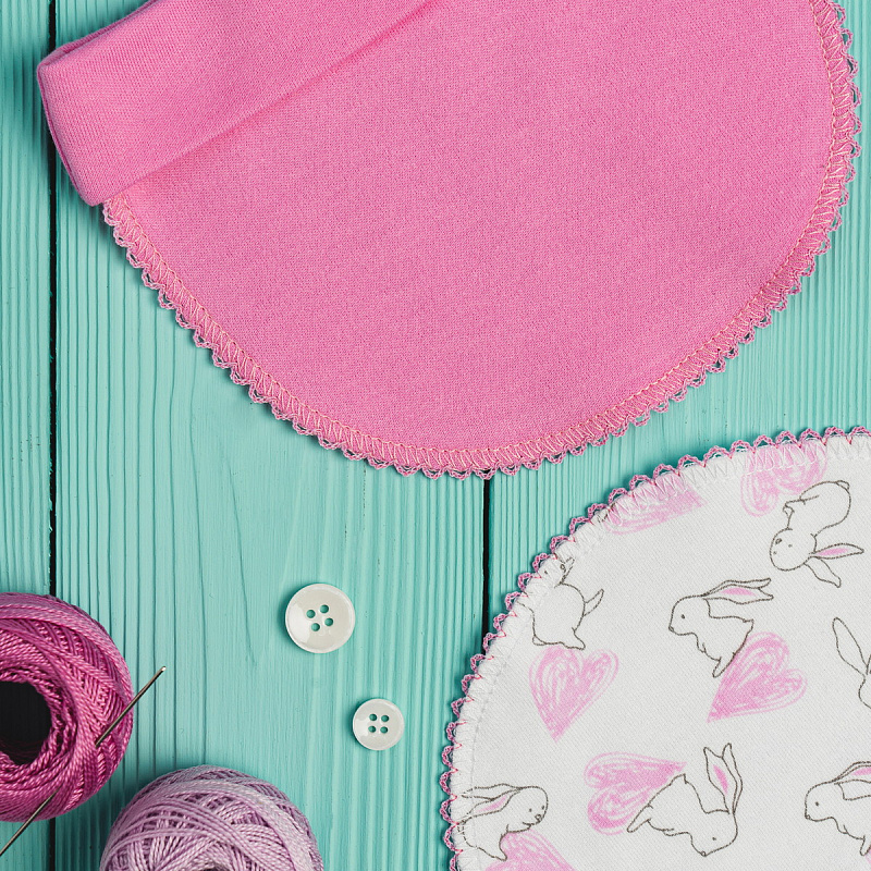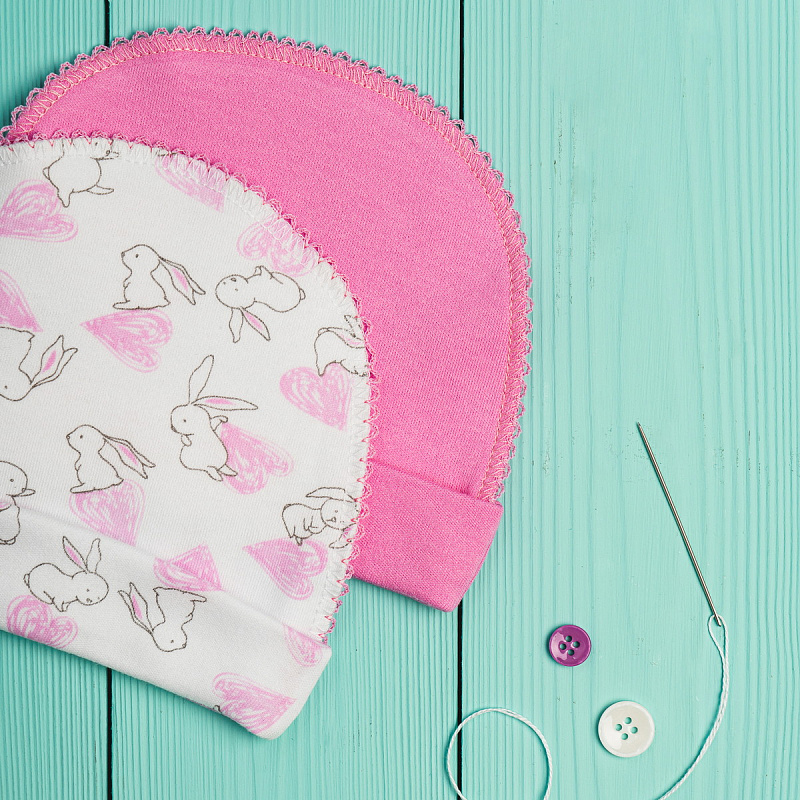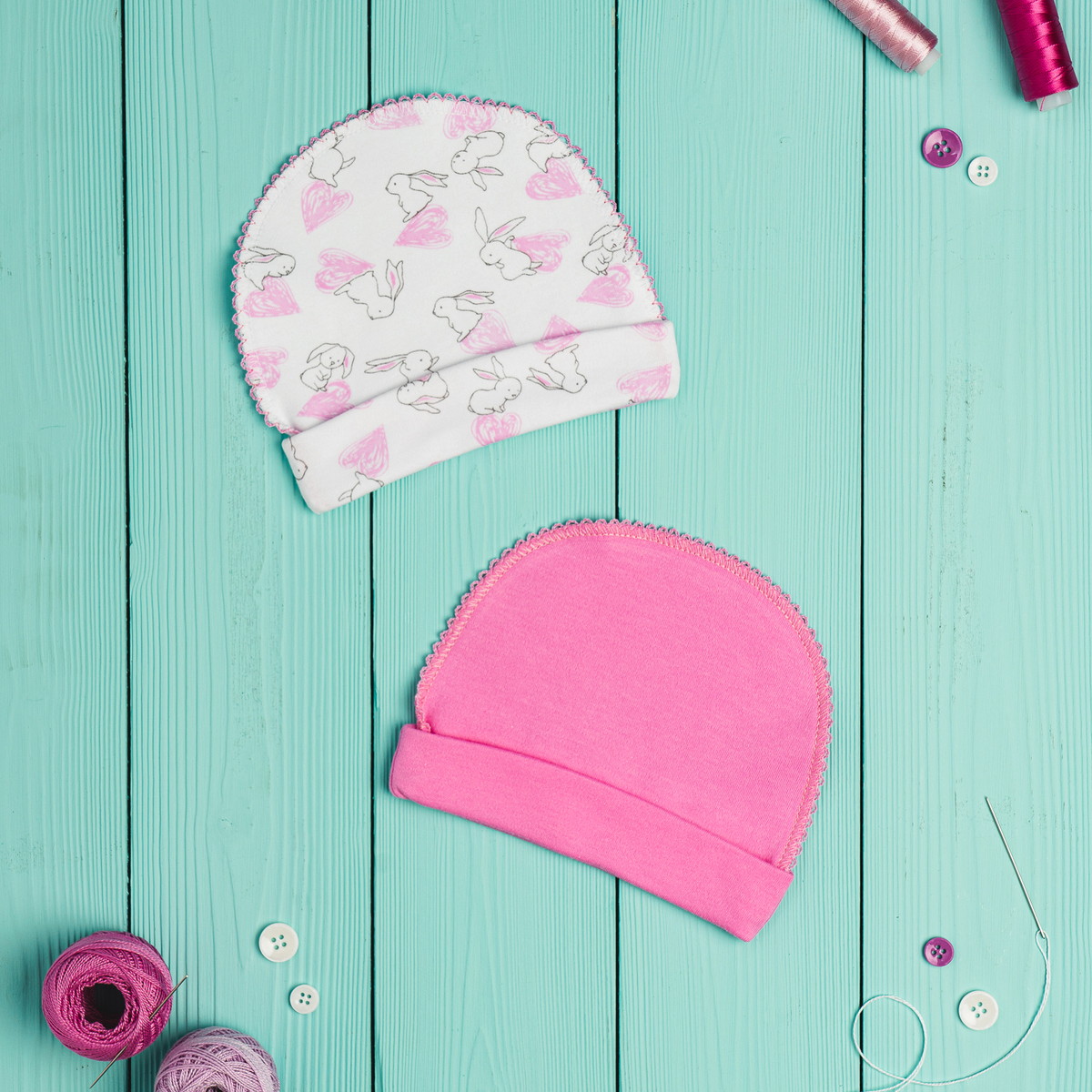 Комплект шапочек состоит их двух изделий. Модели выполнены из натуральной хлопковой ткани, которая хорошо пропускает воздух и немного тянется. Швы изделий выполнены с наружной части и не вызывают дискомфорта у ребенка.
