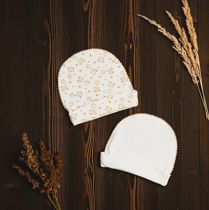 Комплект шапочек состоит их двух изделий. Модели выполнены из натуральной хлопковой ткани, которая хорошо пропускает воздух и немного тянется. Швы изделий выполнены с наружной части и не вызывают дискомфорта у ребенка.