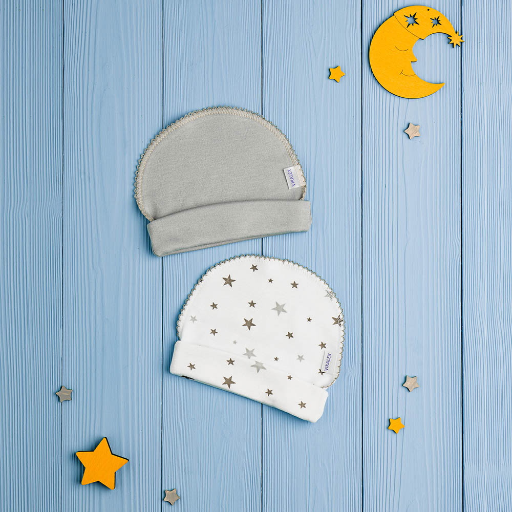 Комплект шапочек состоит их двух изделий. Модели выполнены из натуральной хлопковой ткани, которая хорошо пропускает воздух и немного тянется. Швы изделий выполнены с наружной части и не вызывают дискомфорта у ребенка.