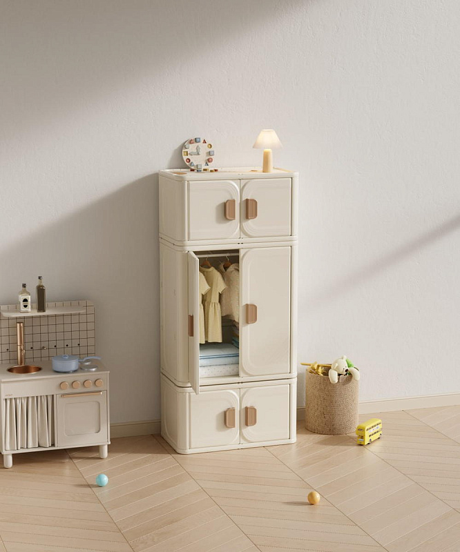 Детский шкаф выполнен из качественного пищевого пластика, он гипоаллергенен, не имеет запаха и абсолютно безопасен для детей. Качественный пластик не подвержен UV-излучению, поэтому не выгорит на солнце и не потеряет свой цвет. Двухстворчатая конструкция легко моется, поэтому поддерживать чистоту не составит труда. Сглаженные углы выполнены с большим вниманием к безопасности малыша. Надежные шурупы помещены в углубления, не давая раскрутить их маленьким ручкам.