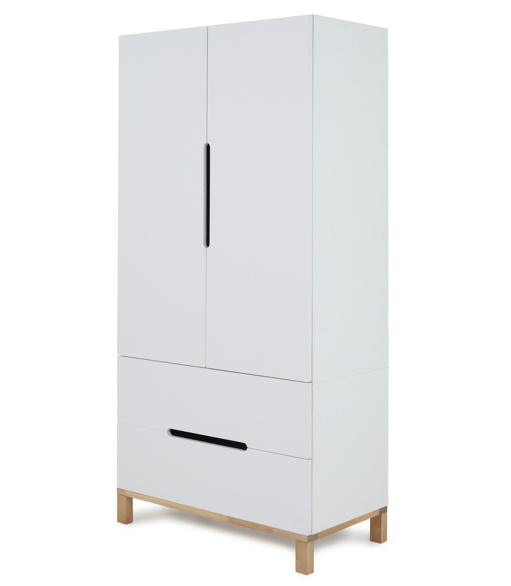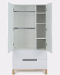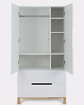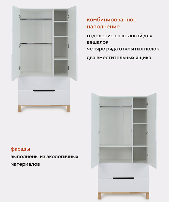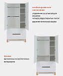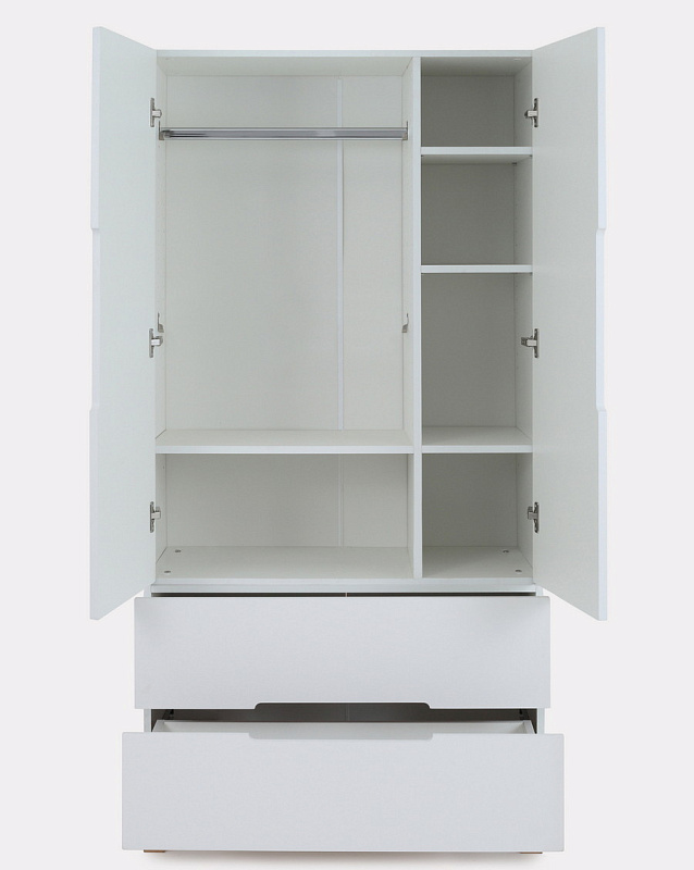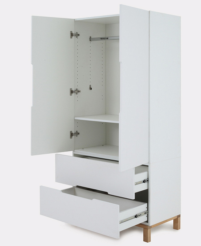 - эргономичный шкаф включает в себя все, что понадобится для хранения вещей ребенка как в настоящее время, так и в будущем: объемное отделение с двумя штангами для плечиков и полочкой (все элементы съемные); четыре ряда полок; пара вместительных выдвижных ящиков