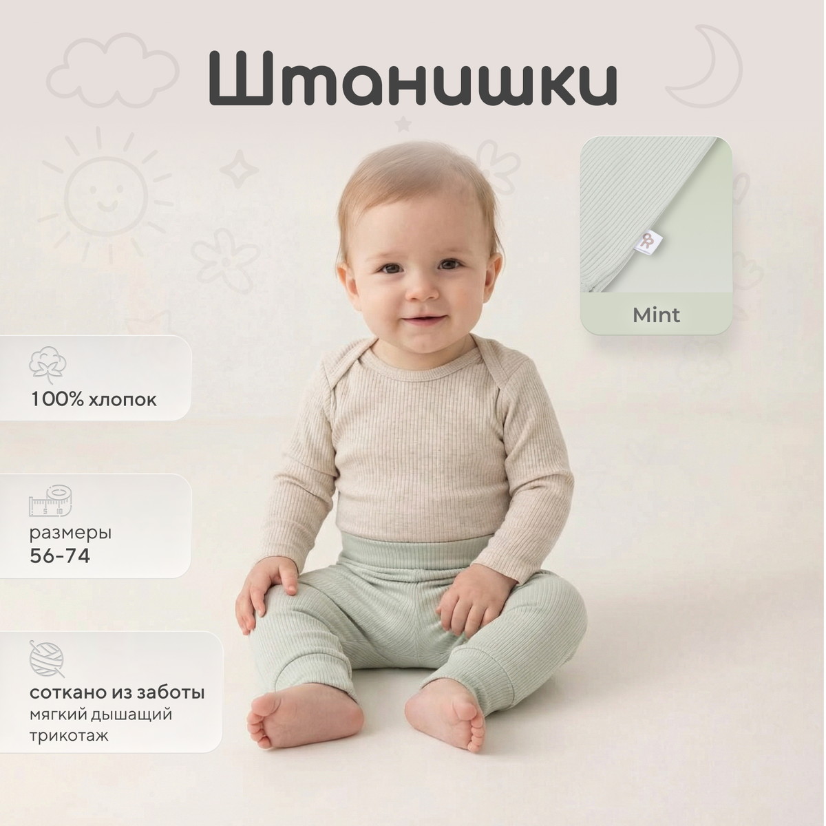 Штанишки из этой коллекции дополнены мягким широким поясом и манжетами - на маленькие ножки и крохотный животик резинка давить не будет.