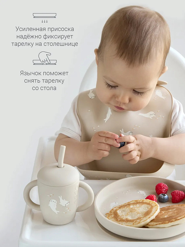 Тарелка выполнена из 100% гипоаллергенного платинового силикона — безопасного, и устойчивого к нагреванию материала без BPA. Продуманная присоска, усиленная за счёт специального угла, надёжно фиксирует тарелку на столе, а удобный язычок позволяет легко открепить её после еды. Выверенная высота бортиков удерживает еду внутри, поддерживая аккуратность и комфорт. Всё продумано до мелочей — чтобы забота ощущалась в каждом прикосновении.