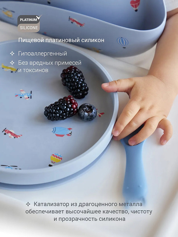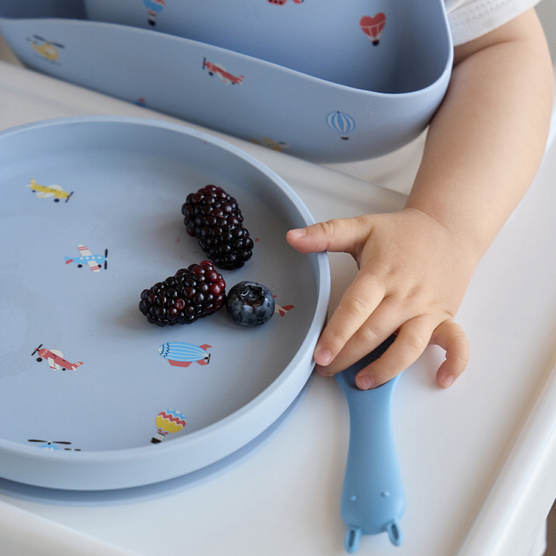 Тарелки представлены в четырех оттенках и принтах: Тюлень, Воздушный транспорт, Черника, Птички. Теперь можно собрать полноценную единую коллекцию посуды для малыша: поильник, тарелка, нагрудник и ложечки.