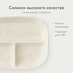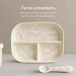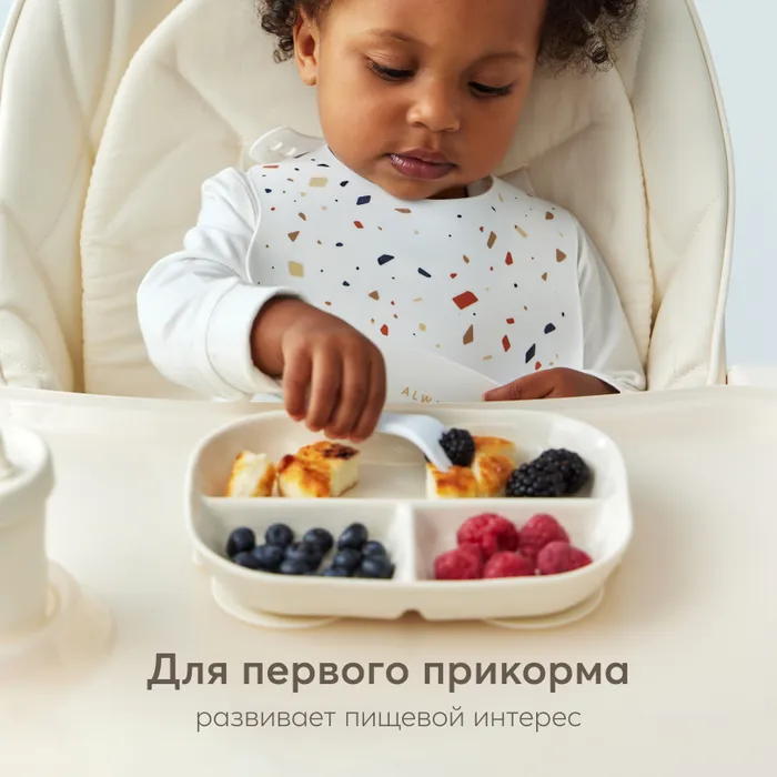 Порционная силиконовая тарелка идеально подходит для первых самостоятельных приемов пищи малыша. Разделена на три секции: это позволяет удобно раскладывать разные виды продуктов, избегая их смешивания. Благодаря надежной присоске тарелка прочно фиксируется на поверхности, предотвращая переворачивание и разливы. Тарелка легко моется как вручную, так и в посудомоечной машине. Компактная форма и современный дизайн делают её удобной для ежедневного использования.