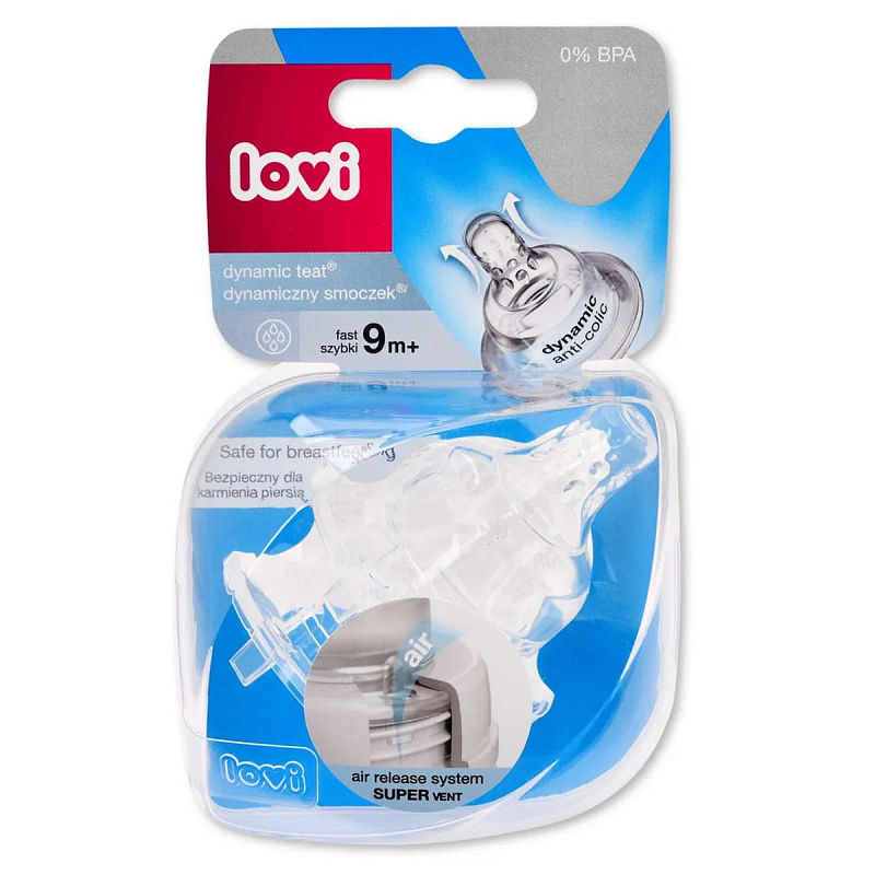 Данная модель соски имеет отверстие быстрой скорости потока и подходит для детей старше 9-ти месяцев. Динамическая соска LOVI очень похожа по тактильным ощущениям на сосок матери. Соска разработана по уникальной технологии неоднородных слоев силикона: имеет мягкий, тонкий растягивающийся кончик и твердое, широкое, профилированное основание. Благодаря чему не препятствует грудному вскармливанию и ребенок буквально мгновенно привыкает к ней и не испытывает стресса.