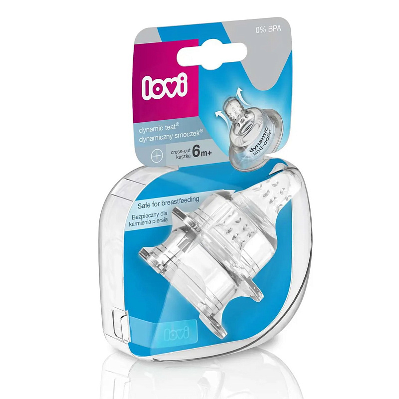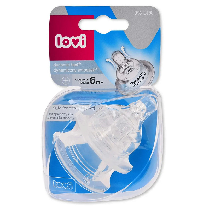Данная модель соски имеет крестообразное отверстие и подходит для каш и густых жидкостей. Динамическая соска LOVI очень похожа по тактильным ощущениям на сосок матери. Соска разработана по уникальной технологии неоднородных слоев силикона: имеет мягкий, тонкий растягивающийся кончик и твердое, широкое, профилированное основание. Благодаря чему не препятствует грудному вскармливанию и ребенок буквально мгновенно привыкает к ней и не испытывает стресса.Силиконовая соска не имеет вкуса и запаха, а срок службы значительно больше, чем у латексной соски.