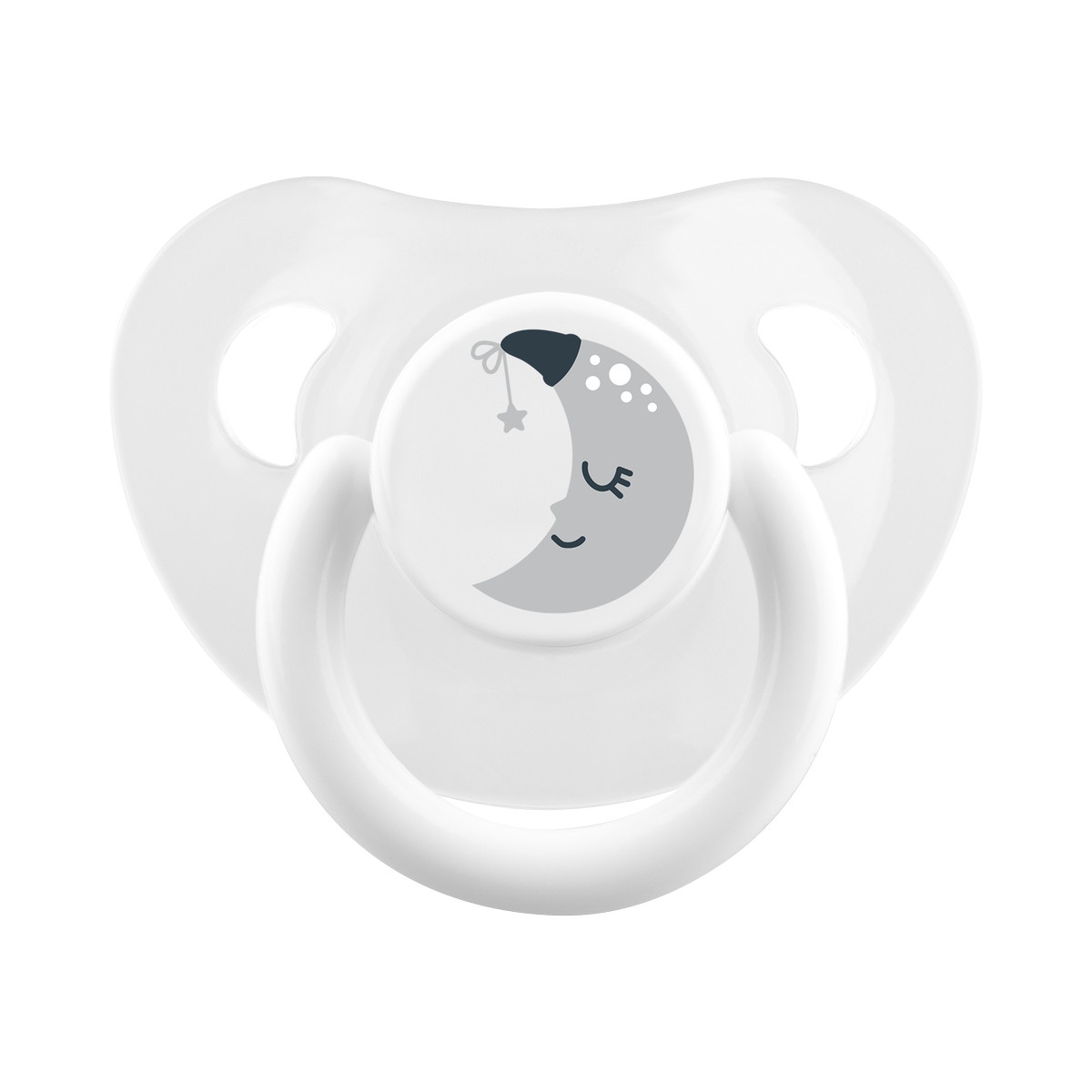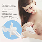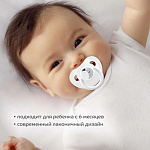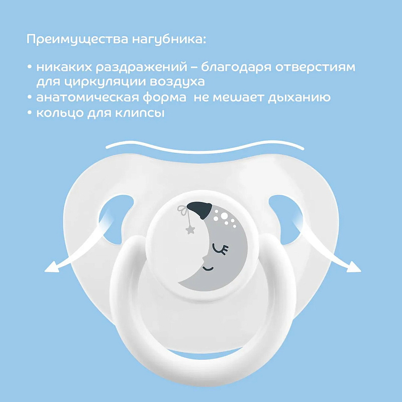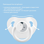 Соска-пустышка со скошенным силиконовым соском предназначена для детей от 6 месяцев. Форма нагубника с симметрично расположенными отверстиями обеспечивает свободную циркуляцию воздуха для предотвражения появления опрелостей.