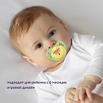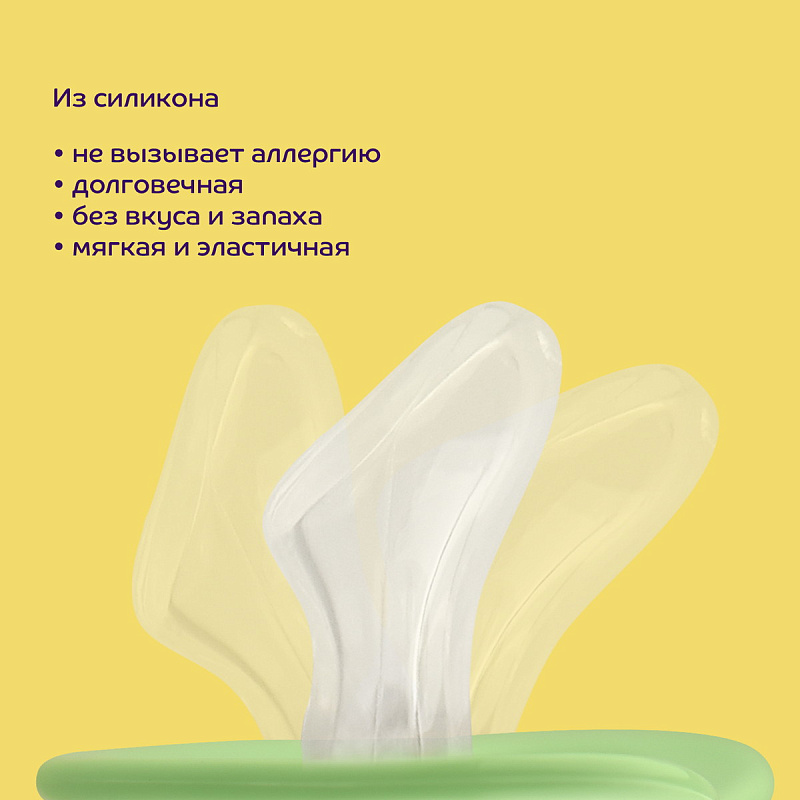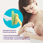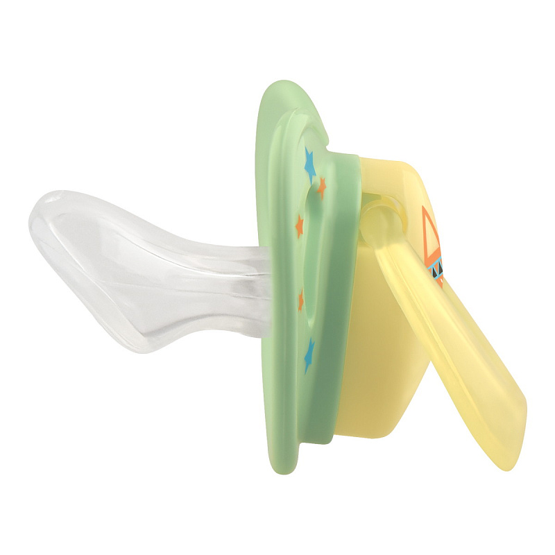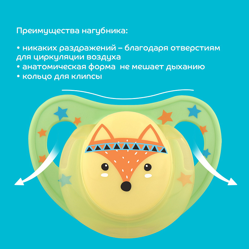 Соска-пустышка со скошенным силиконовым соском предназначена для детей от 6 месяцев. Форма нагубника с симметрично расположенными отверстиями обеспечивает свободную циркуляцию воздуха для предотвращения появления опрелостей. Специальное углубление на нагубнике не мешает дыханию. Указанный возраст является рекомендованным и зависит от индивидуальных особенностей развития ребенка.