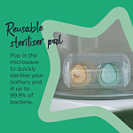 Пустышка не содержит BPA, она мягкая и гибкая, но в то же время прочная и долговечная. Изделие очень легко моется, не впитывает запахи. Легко чистится — просто поместите в стерилизатор, вымойте вручную или в посудомоечной машине.