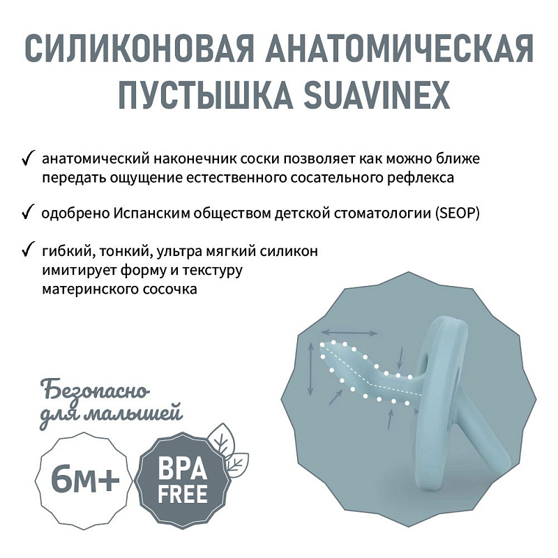 Детская ортодонтическая пустышка Suavinex COLOUR ESSENCE выполнена из ультрамягкого силикона с пескоструйной обработкой, к которому не налипает пыль и ворс. Соска со скошенным краем анатомически правильно располагается во рту ребенка, не препятствуя естественному развитию ротовой полости и прикуса.