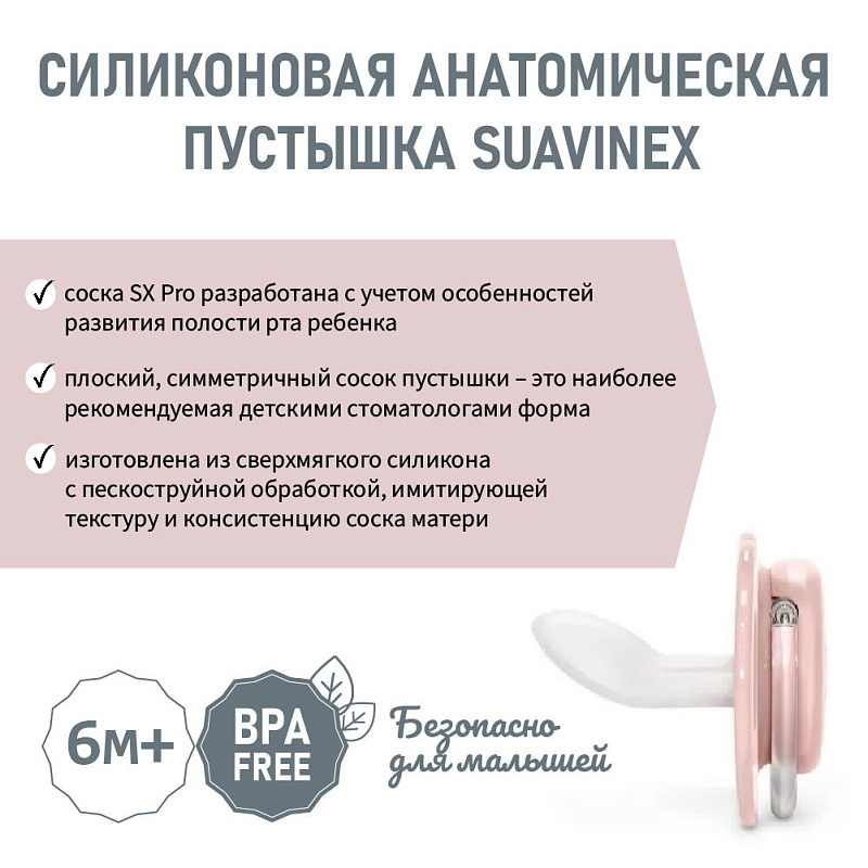 Пустышка Suavinex с силиконовой соской SX Pro, которая анатомически правильно располагается во рту ребенка, не препятствуя естественному развитию ротовой полости и прикуса.