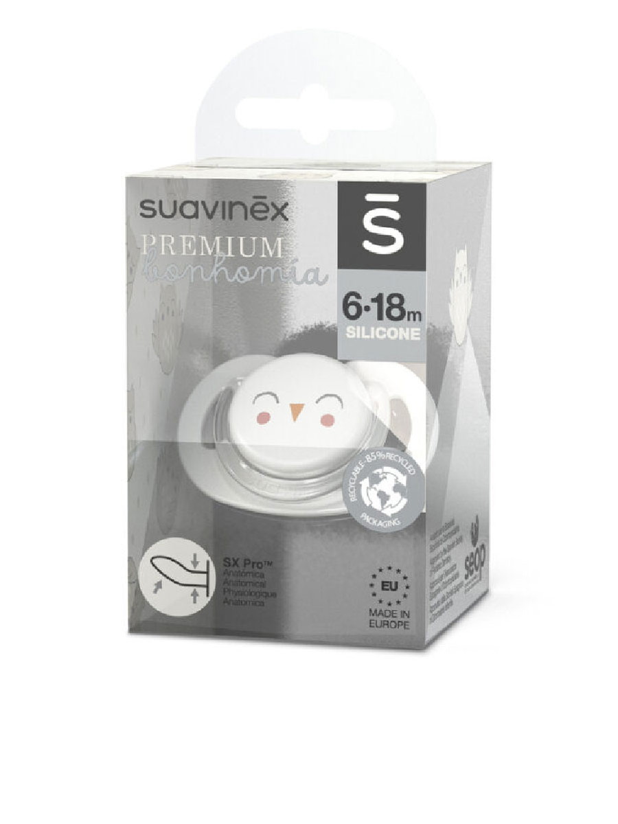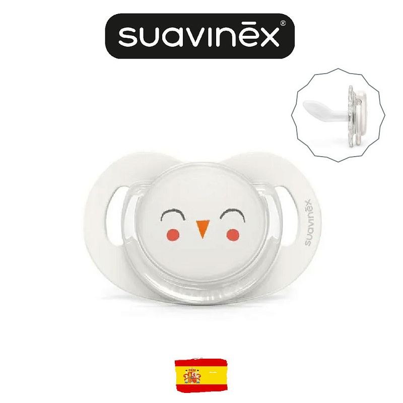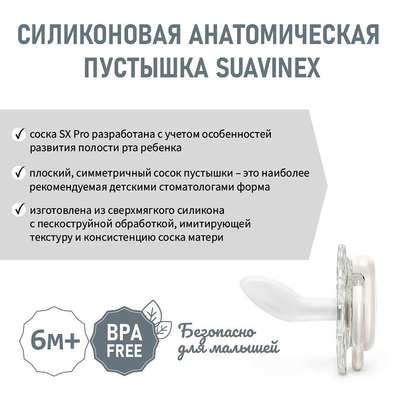 Пустышка Suavinex с силиконовой соской SX Pro, которая анатомически правильно располагается во рту ребенка, не препятствуя естественному развитию ротовой полости и прикуса.