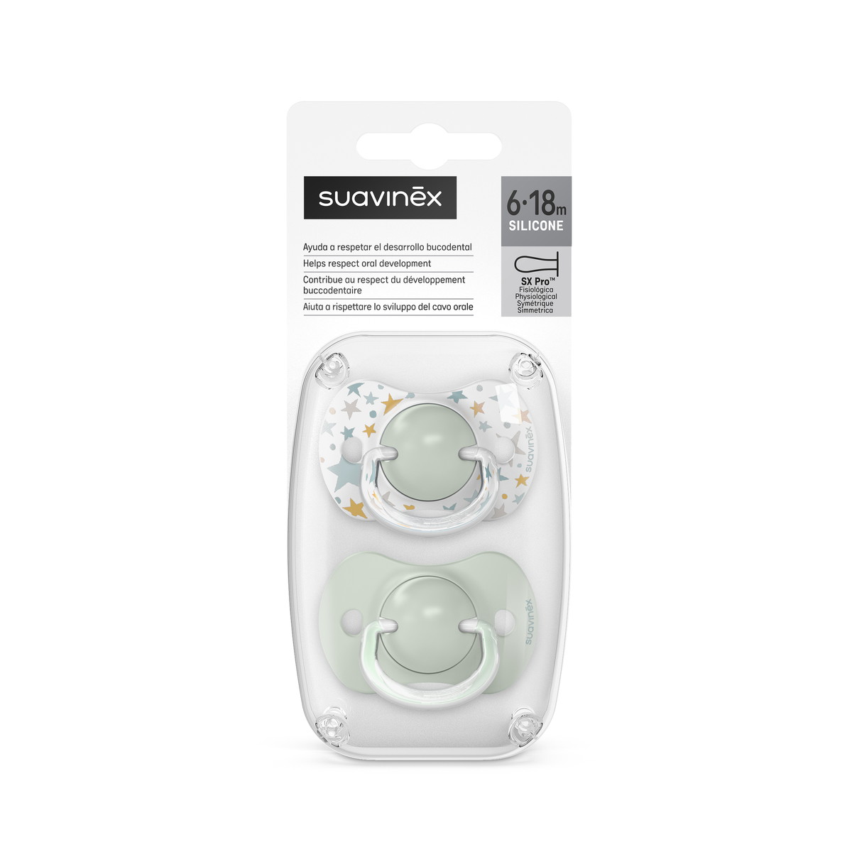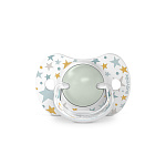 Пустышка Suavinex с физиологической силиконовой соской SX Pro, которая анатомически правильно располагается во рту ребенка, не препятствуя естественному развитию ротовой полости и прикуса.