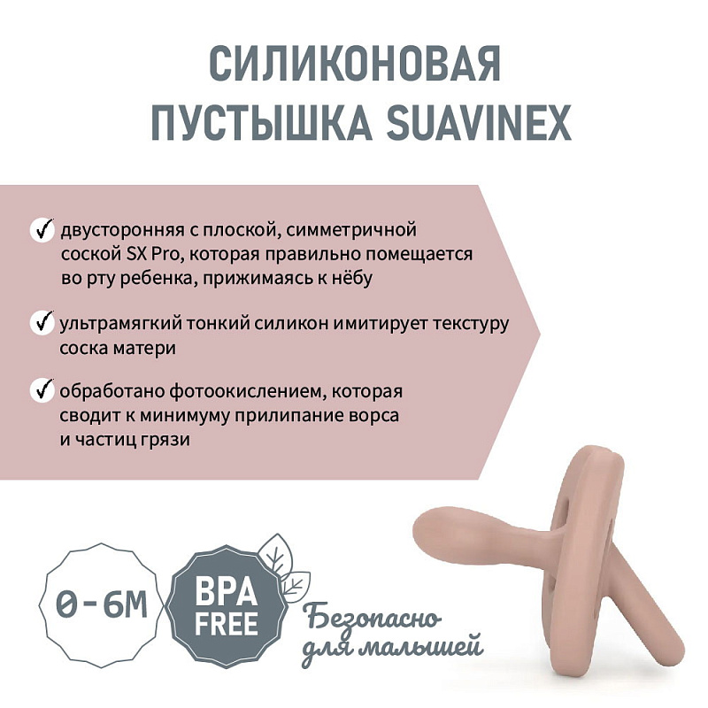 Детская ортодонтическая пустышка Suavinex COLOUR ESSENCE выполнена из ультрамягкого силикона с пескоструйной обработкой, к которому не налипает пыль и ворс. Плоская симметричная соска анатомически правильно располагается во рту ребенка, не оказывая давления на нёбо и не препятствуя естественному развитию ротовой полости и прикуса.