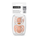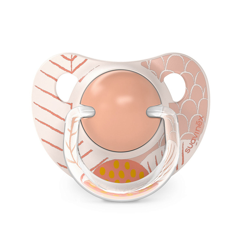 Анатомическая пустышка Suavinex с соской со скошенным краем анатомически правильно располагается во рту ребенка, не препятствуя естественному развитию ротовой полости и прикуса.