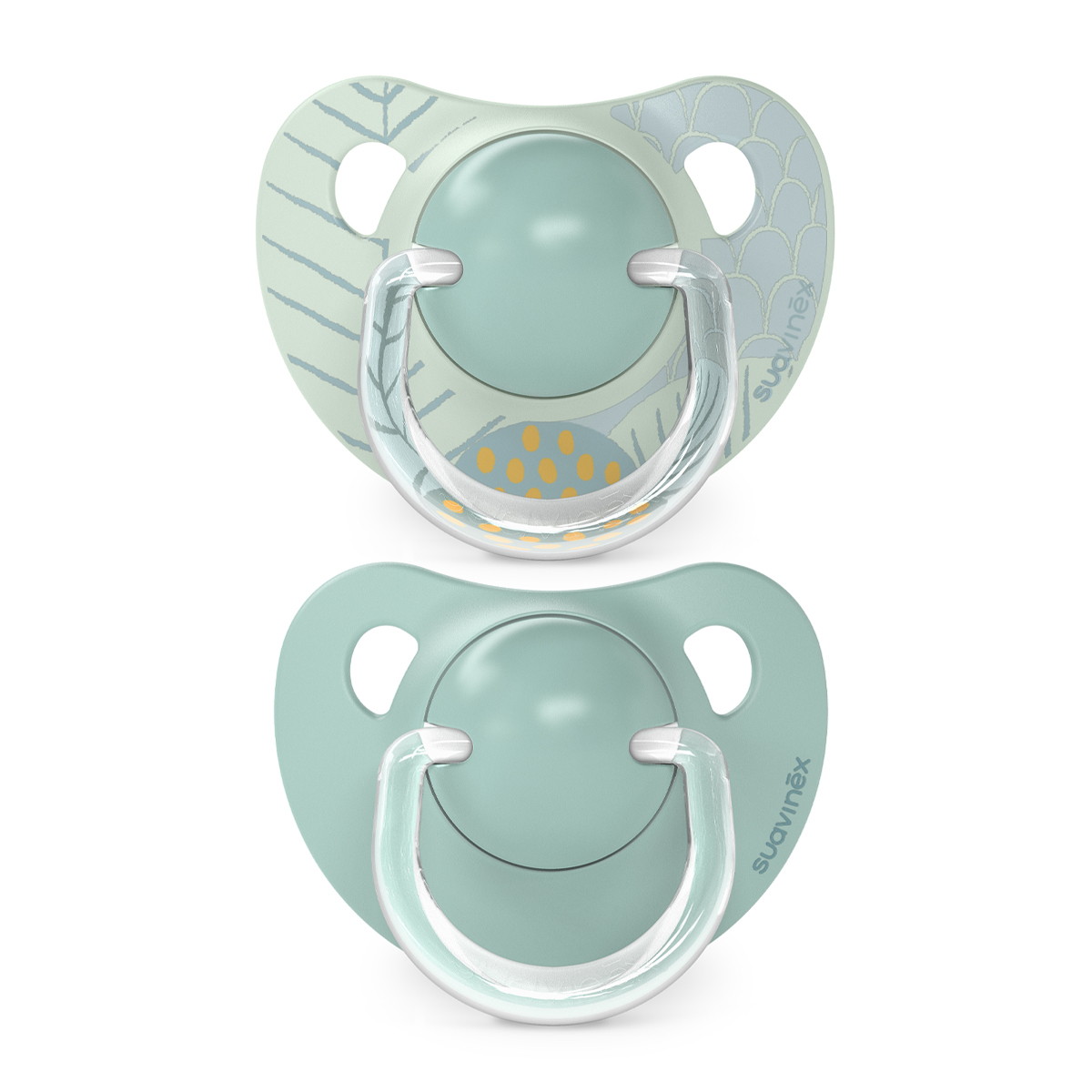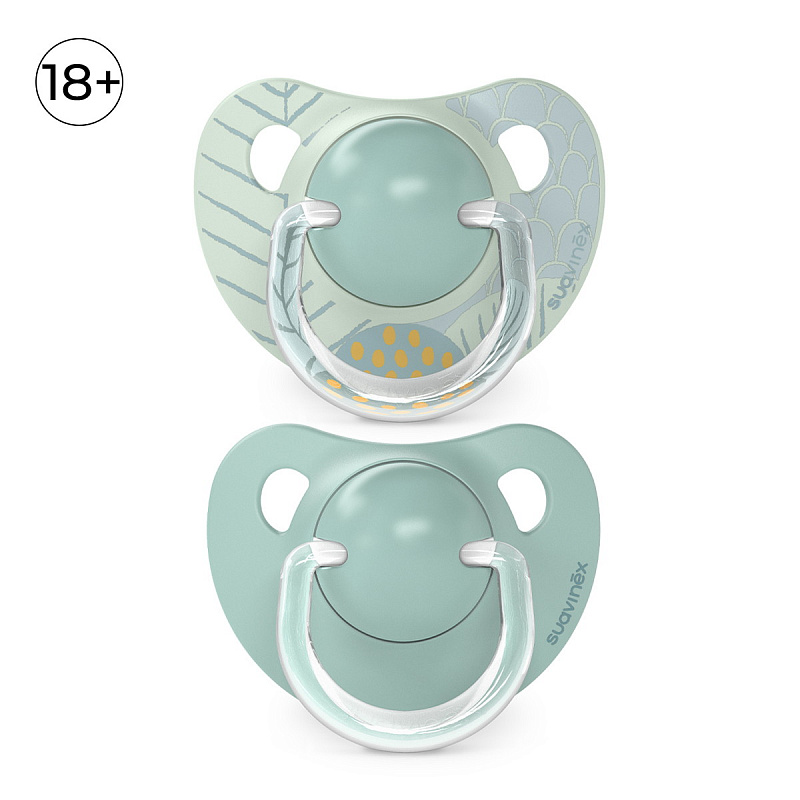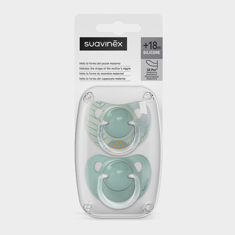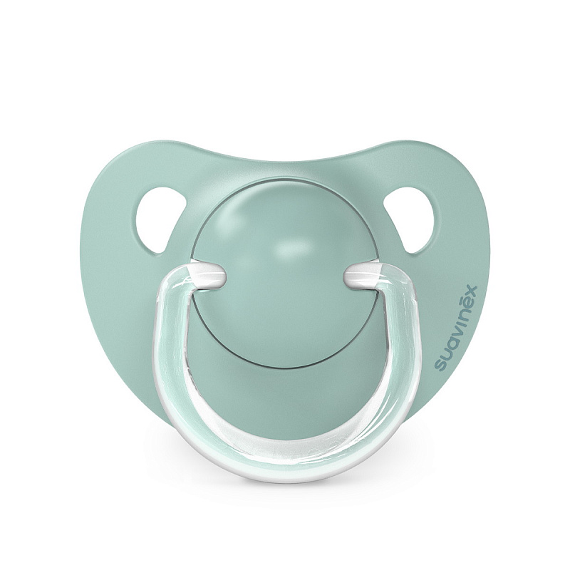 Анатомическая пустышка Suavinex с соской со скошенным краем анатомически правильно располагается во рту ребенка, не препятствуя естественному развитию ротовой полости и прикуса.