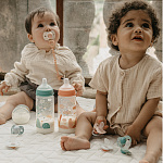 - Ультрамягкий тонкий силикон с фактурным покрытием имитирует ощущение и текстуру материнского соска, обеспечивает идеальную гибкость пустышки