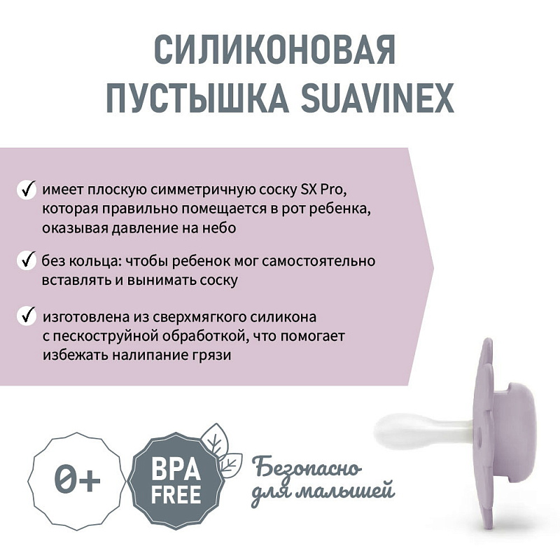 - Плоская симметричная соска SX Pro анатомически правильно помещается во рту ребенка, не оказывает давление на небо и не нарушает формирование прикуса