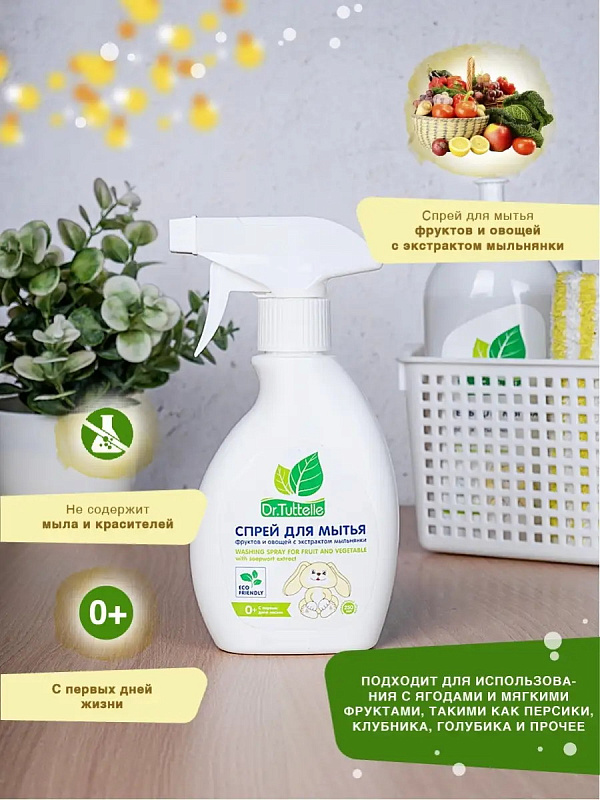 Спрей для мытья фруктов и овощей с экстрактом мыльнянки Dr.Tuttelle. Экологически чистое моющее средство с содой, пищевым спиртом и экстрактом мыльнянки предназначено для мытья свежих фруктов и овощей, таких как яблоки, апельсины, виноград, помидоры, красный перец, огурцы, брокколи и так далее. Подходит для использования с ягодами и мягкими фруктами, такими как персики, клубника, голубика и прочее. Не рекомендуется для грибов из-за их пористой структуры. Входящая в состав сода эффективно удаляет налет на поверхности фруктов или овощей, а натуральный экстракт мыльнянки создает пену, которая легче смывает грязь, не оставляя привкуса и пленки.