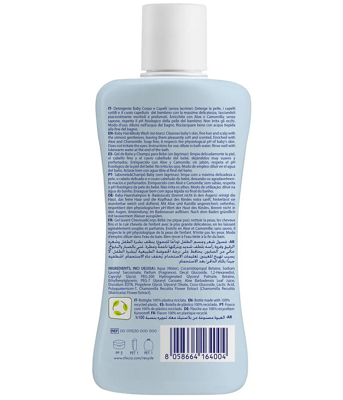 Средство для мытья волос и тела без слез обеспечивает максимально мягкое очищение кожи ребенка, создавая эффект приятной мягкости. Формула включает ультрамягкие поверхностно-активные компоненты, которые были тщательно отобраны и представлены в сбалансированных концентрациях. Она обеспечивает идеальное очищение чувствительной кожи малыша и гарантирует максимально мягкое воздействие. Продукт идеален для тонких и нежных волос младенца. Присутствие пережиривающих и кондиционирующих компонентов придает волосам мягкость, приятный запах и облегчает их расчесывание. Не раздражает глаза. УКАЗАНИЯ ПО ПРИМЕНЕНИЮ: добавьте в воду для купания (37 °C). Смойте теплой водой по окончанию купания. Продукт идеален для ежедневного использования. Натуральные активные вещества: Алоэ: увлажняющее и успокаивающее действие. Ромашка: увлажняющее и смягчающее действие. Бетаин: увлажняющее и защитное действие. Поддерживает физиологический pH кожи: в ходе лабораторных тестов оценивался уровень pH кожи до и после использования продукта. Полученные результаты сравнивались с показателями кожи, не имевшей контакта с продуктом или имевшей контакт с водой. Показатель pH не отличался от показателя, зарегистрированного в группе контроля*. *Abich, report REL/0100/2015/CLI/SAB, 22/01/2015.