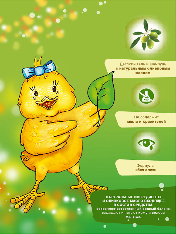 Детское средство для купания и шампунь с маслом оливы гармонично сочетает в себе достоинства мягкого детского шампуня и геля для мытья малыша. Натуральные ингредиенты и оливковое масло, входящие в состав средства, сохраняют естественный водный баланс, защищают и питают кожу и волосы малыша. Идеально подходит для ежедневного применения!