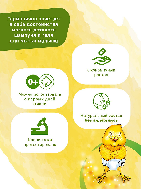 Способ применения: выдавите необходимое количество средства на руку, вспеньте и нанесите мягкими массирующими движениями на тело и голову ребенка, затем смойте теплой водой.
