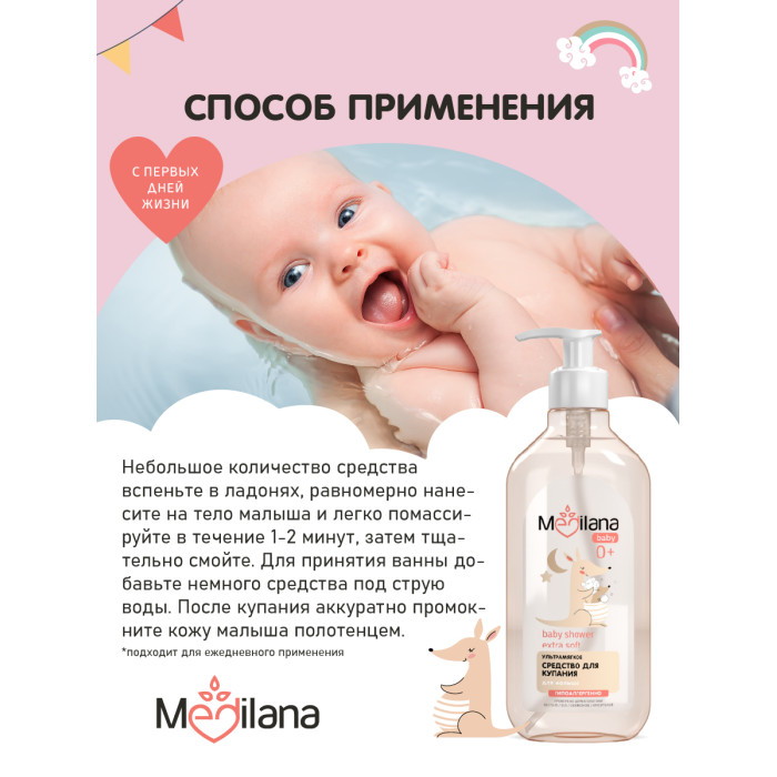 Способ применения: Небольшое количество средства вспеньте в ладонях, равномерно нанесите на тело малыша и легко помассируйте в течение 1-2 минут, затем тщательно смойте. Для принятия ванны добавьте немного геля под струю воды. После купания аккуратно промокните кожу малыша полотенцем. Подходит для ежедневного применения