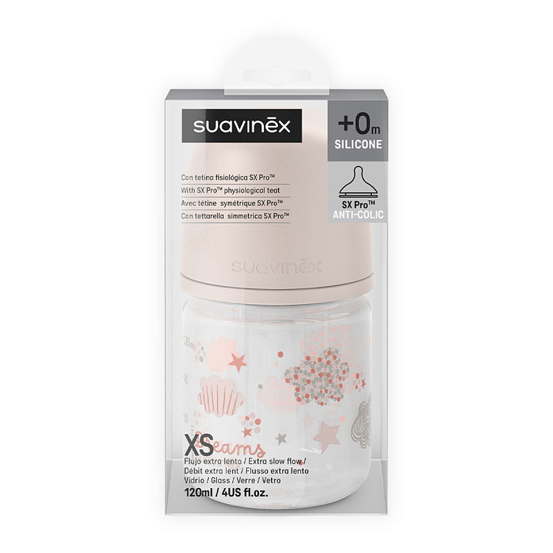 Стеклянная бутылочка Suavinex FXS S 120 мл, с соской из сверхмягкого силикона 308237 PINK